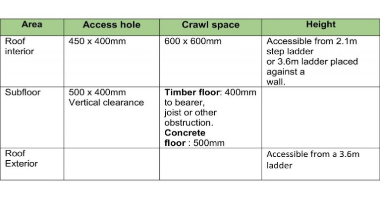 Only areas to which reasonable access is available were inspected. The Australian Standard 4349.3 defines reasonable access as “areas where safe, unobstructed access is provided and the minimum clearances specified in the Table below are available or, where these clearances are not available, areas within the consultant’s unobstructed line of sight and within arm’s length. Reasonable access does not include removing screws and bolts to access covers.” Reasonable access does not include the use of destructive or invasive inspection methods. Nor does reasonable access include cutting or making access traps, or moving heavy furniture or stored goods.